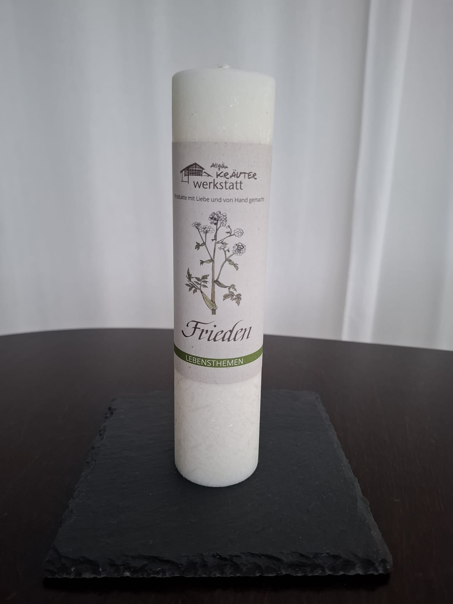 In Jedem steckt die Sehnsucht nach Heilung des Kummers auf der Welt, wieder nach einem Leben im heiligen Frieden, im Einklang mit dem natürlichen Fluss des Lebens. Wir Menschen sind untrennbar mit dem grossen Ganzen verbunden. Es ist wie ein Netz in dem jedes einzigartige Individuum - Mensch, Tier, Pflanze, mit den anderen Geschöpfen und Elementen verwoben ist. Ohne Vision gibt es keine Manifestation und nur wenn wir eine positive Zukunft sehen können, werden wir auch dort ankommen. Gemeinsam besitzen wir Macht, Dinge zu verändern - mit unseren Gedanken vereint zu einem Gedanken und einem Geist. Richten wir mit einem hoffnungsvollen und friedlichen Geist in einer positiven Vision unsere Gedanken auf ein Bild der Erde wie sie aussieht, wenn sie wieder gesund ist, wie die Menschen sind, wenn sie wieder im Einklang mit dem natürlichen Lebensgeist sind und richten wir den Blick nach innen, zu uns selbst - der Frieden im Äusseren beginnt in uns. Friedvolle Gedanken, gute Worte, aufrechtes einiges Handeln. Die Heilpflanzen für die Friedenskerze werden an Orten der Kraft an denen tiefer Frieden, spürbar wahrgenommen wird, achtsam geerntet.