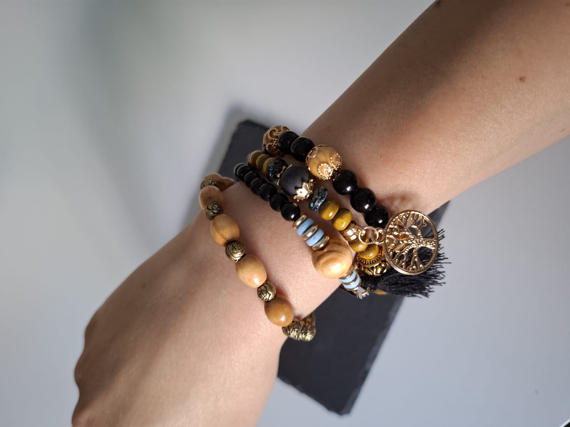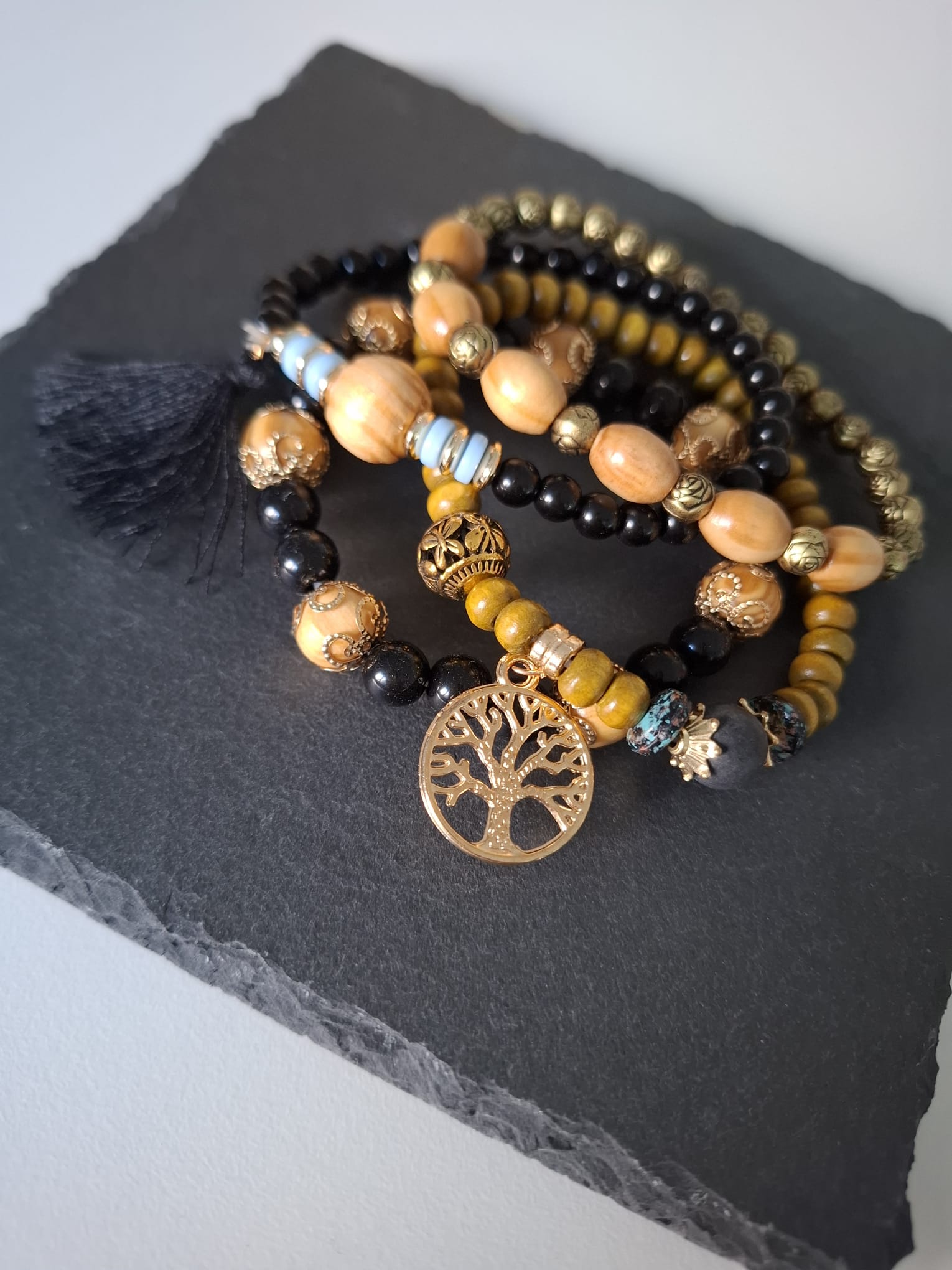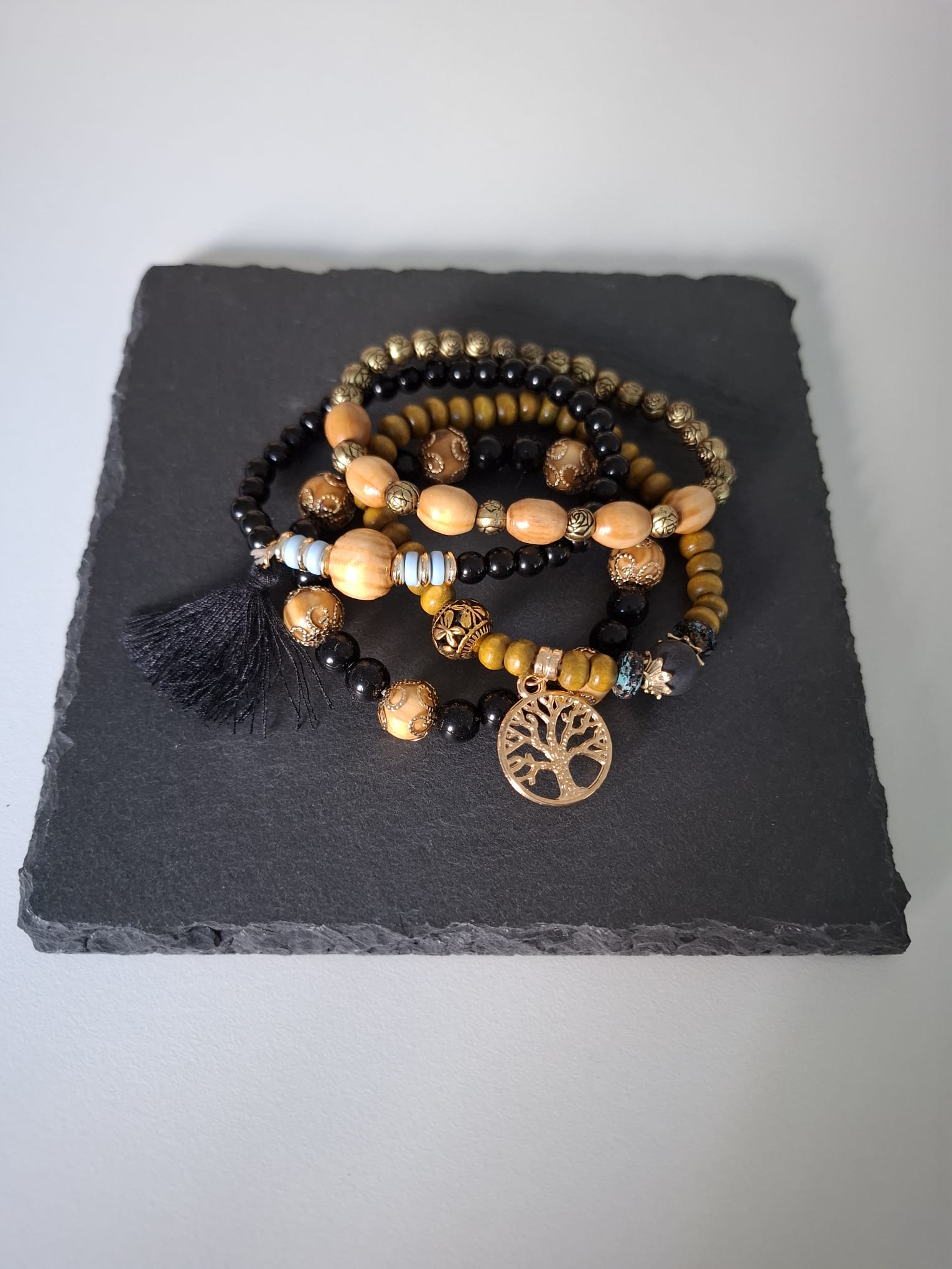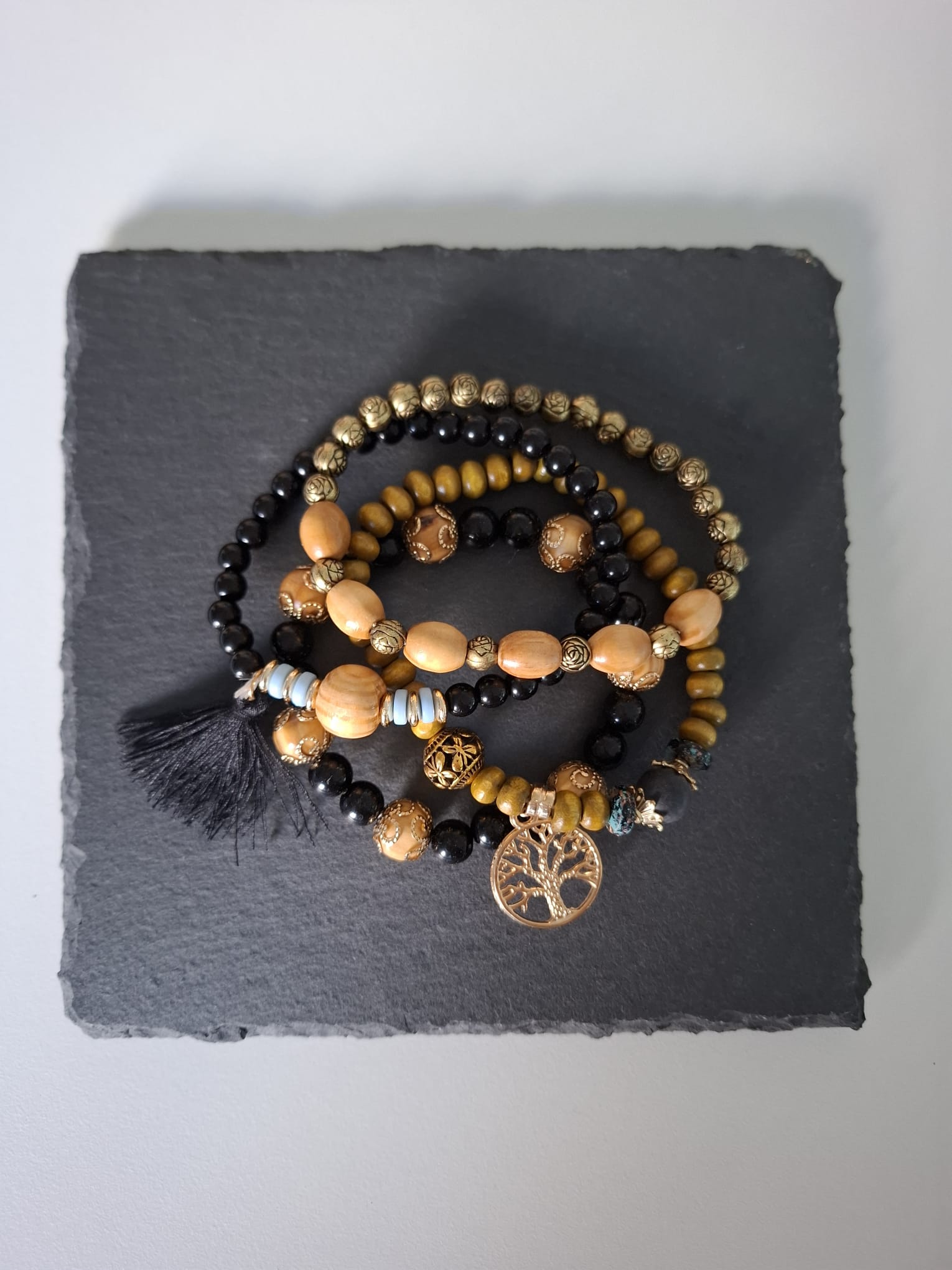 Armband Baum des Lebens schwarz, Holz- und Resinperlen, 6cm flexibel