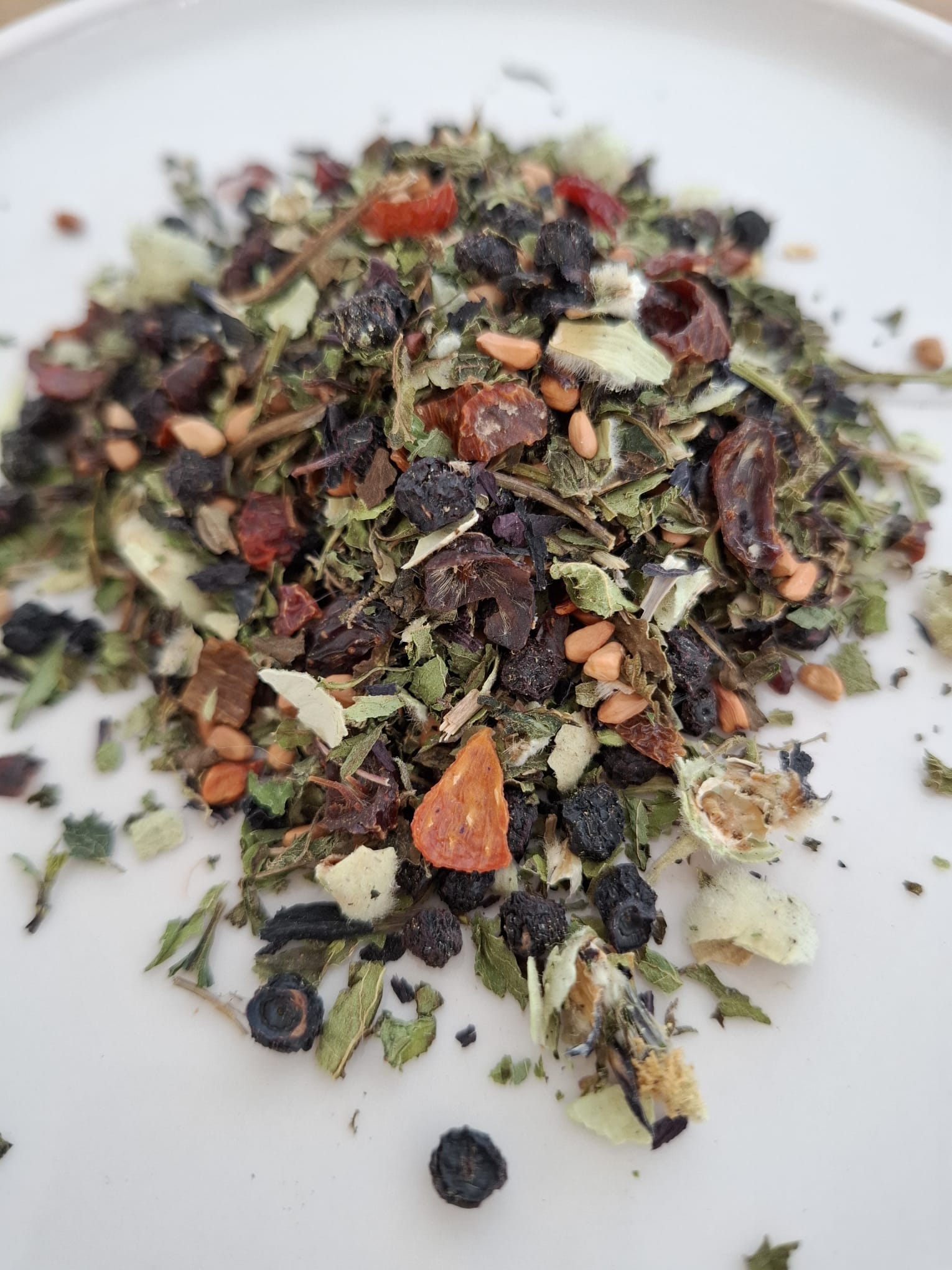 Enthält: Heidelbeeren, Hagebuttenschalen, Pfefferminzblätter, Brennnesselblätter, schwarze Malvenblüten