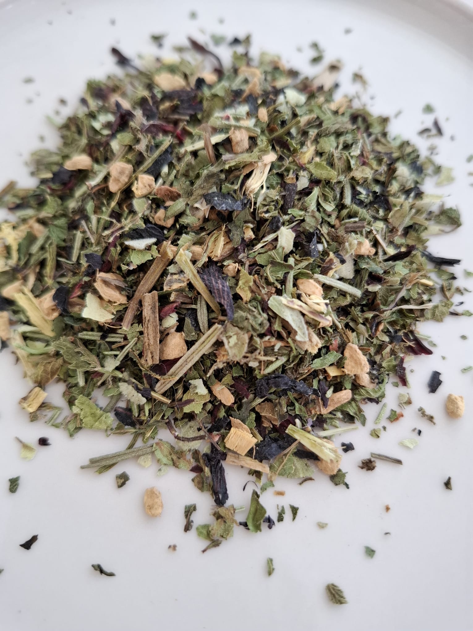 Enthält: Pfefferminzblätter, Brennnessel, Ingwer, Malvenblüte, Hibiskusblüte, Süssholz, Rosmarin