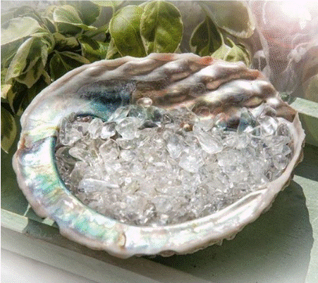 Material: Paua-Muschelschale, reiner Bergkristall und Bergkristall-Trommelsteine