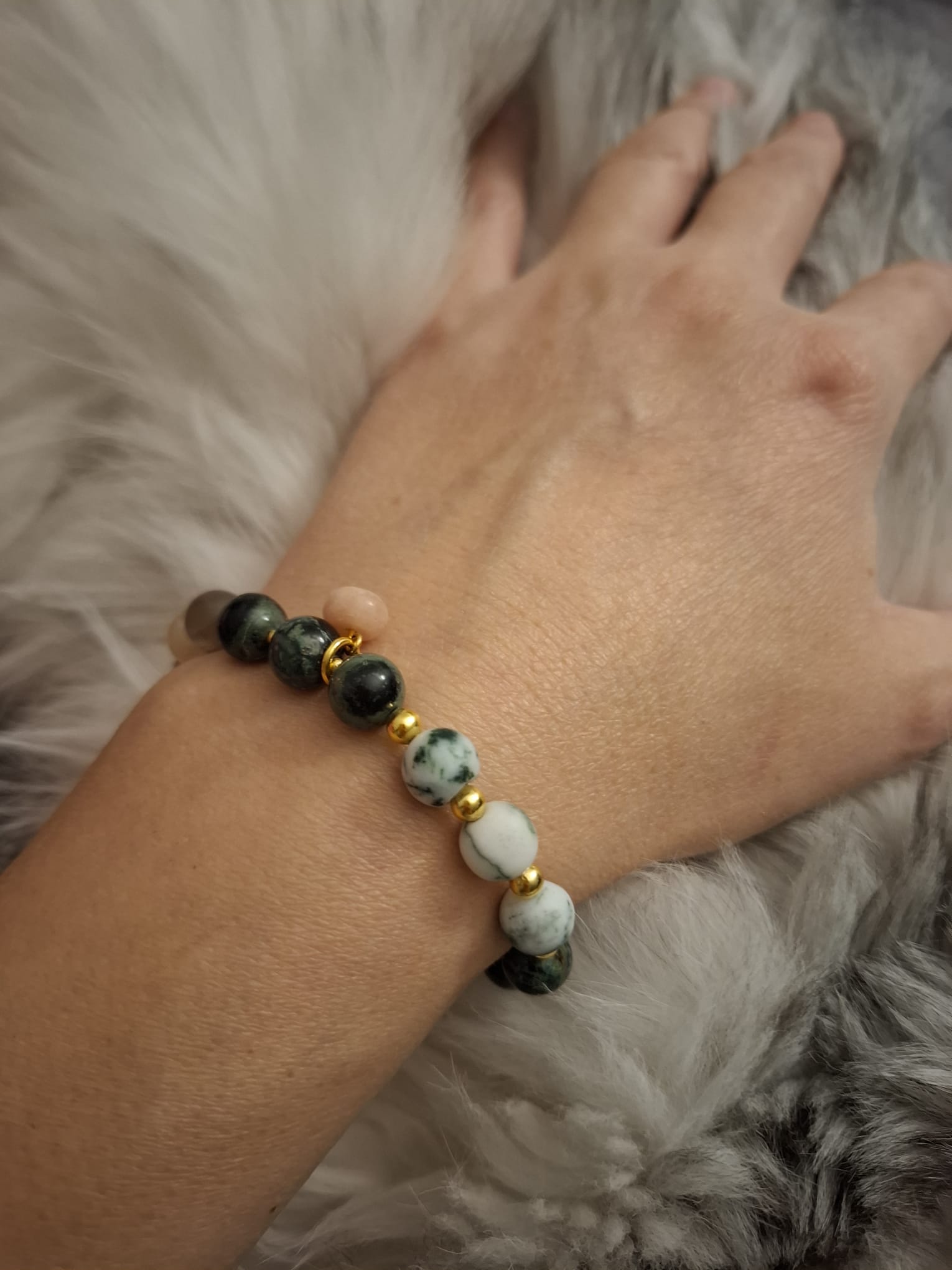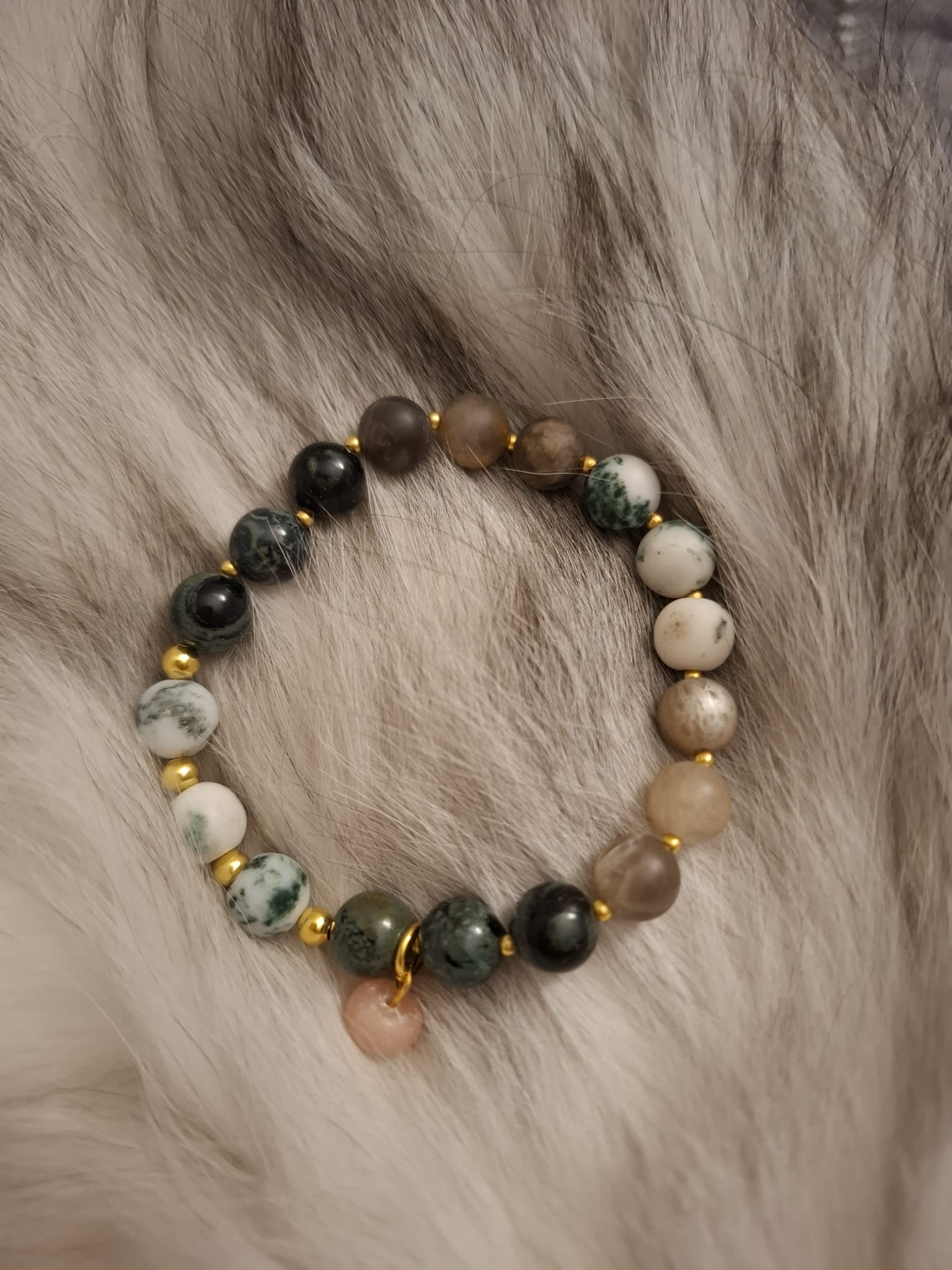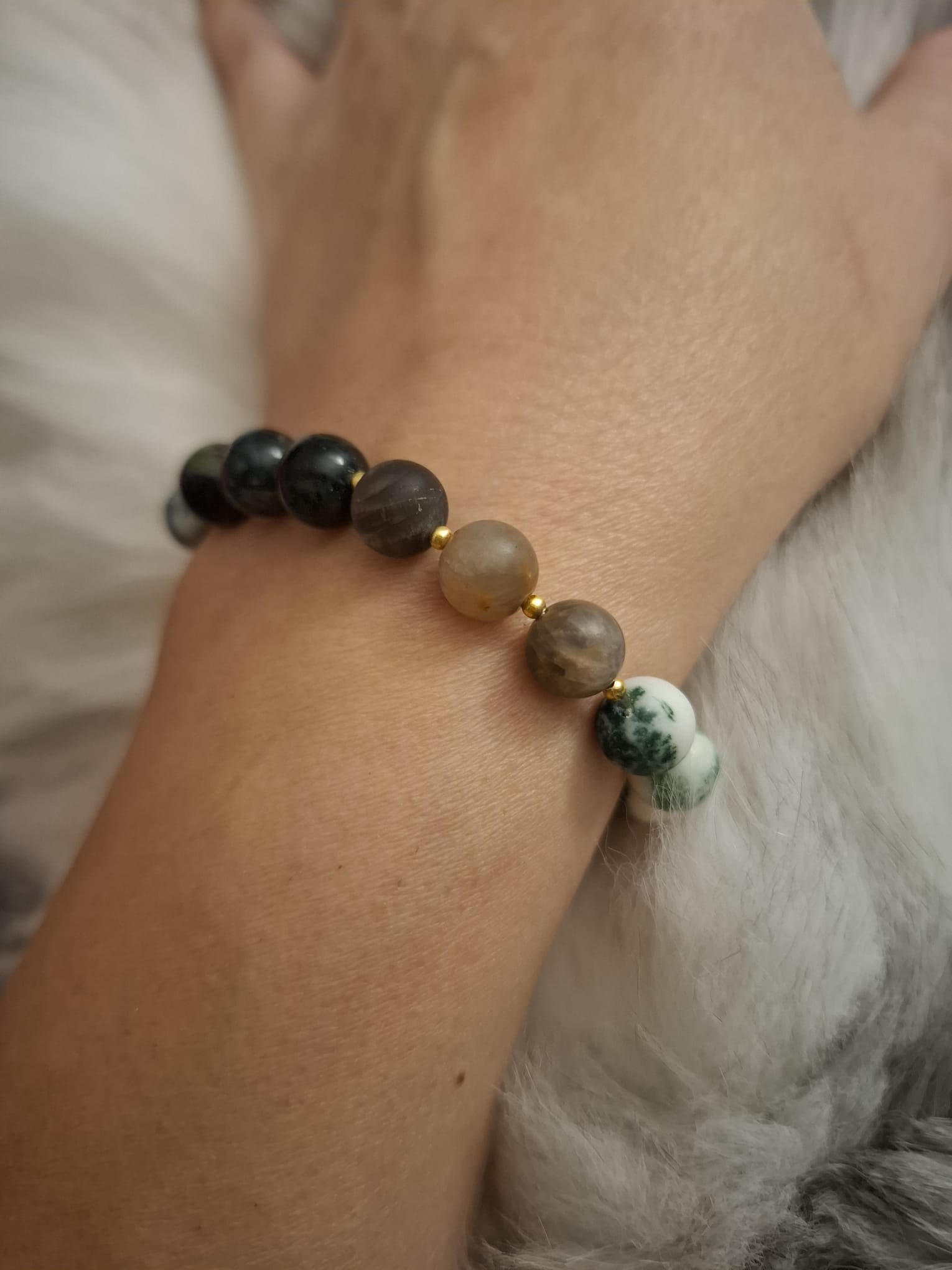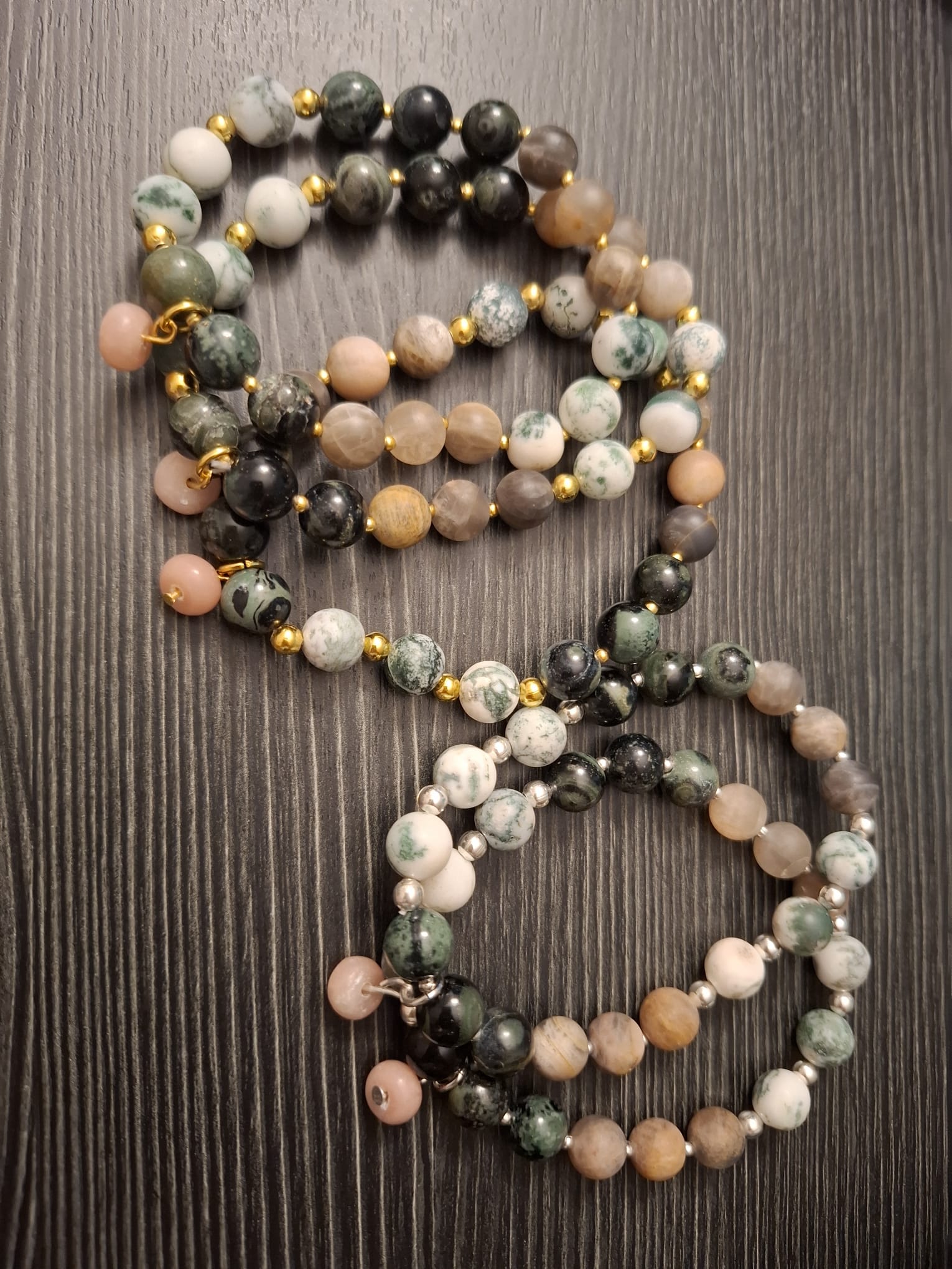 Baum-Achat, dunkler Sonnenstein, Kambaba Jaspis & Anden Opal mit silbernen Elementen