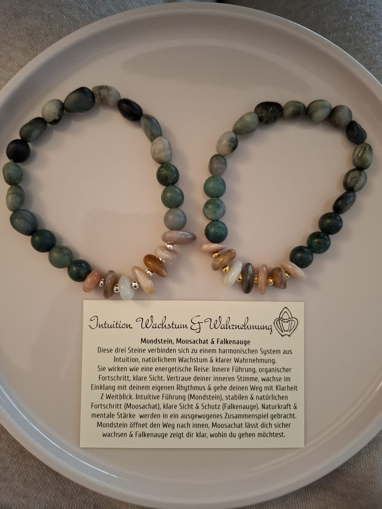 Diese drei Steine verbinden sich zu einem harmonischen System aus Intuition, natürlichem Wachstum & klarer Wahrnehmung. Sie wirken wie eine energetische Reise: Innere Führung, organischer Fortschritt, klare Sicht. Vertraue deiner inneren Stimme, wachse im Einklang mit deinem eigenen Rhythmus & gehe deinen Weg mit Klarheit, Weitblick, intuitive Führung (Mondstein), stabilen & natürlichen Fortschritt (Moosachat), klare Sicht & Schutz (Falkenauge). Naturkraft & mentale Stärke werden in ein ausgewogenes Zusammenspiel gebracht. Mondstein öffnet den Weg nach innen, Moosachat lässt dich sicher wachsen & Falkenauge zeigt dir klar, wohin du gehen möchtest.
