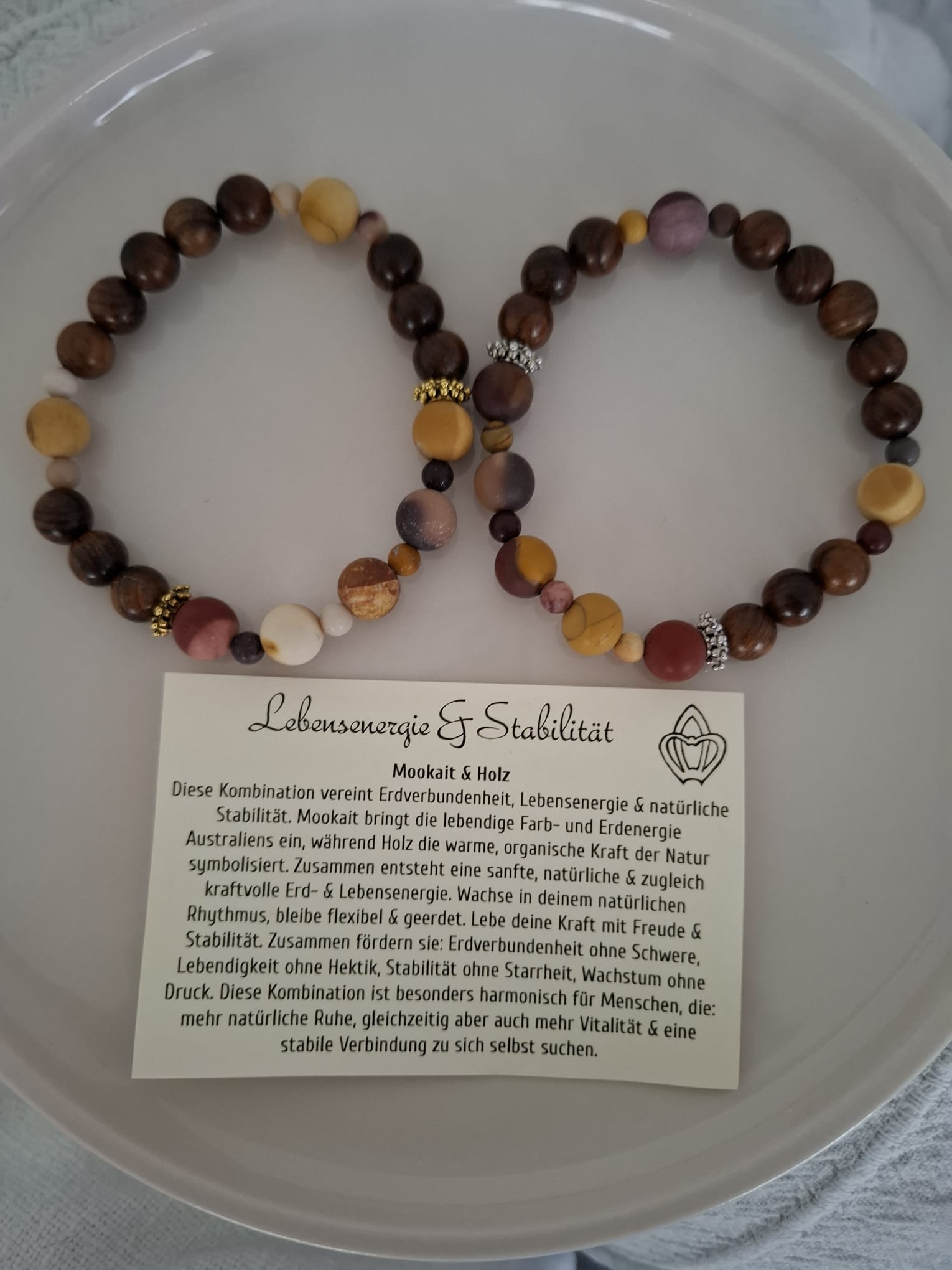 Diese Kombination vereint Erdverbundenheit, Lebensenergie & natürliche Stabilität. Mookait bringt die lebendige Farb- & Erdenergie Australiens ein, während Holz die warme, organische Kraft der Natur symbolisiert. Zusammen entsteht eine sanfte, natürliche & zugleich kraftvolle Erd- & Lebensenergie. Wachse in deinem natürlichen Rhythmus, bleibe flexibel & geerdet. Lebe deine Kraft mit Freude & Stabilität. Zusammen fördern sie: Erdverbundenheit ohne Schwere, Lebendigkeit ohne Hektik, Stabilität ohne Starrheit, Wachstum ohne Druck. Diese Kombination ist besonders harmonisch für Menschen, die: mehr natürliche Ruhe, gleichzeitig aber auch mehr Vitalität & eine stabile Verbindung zu sich selbst suchen.