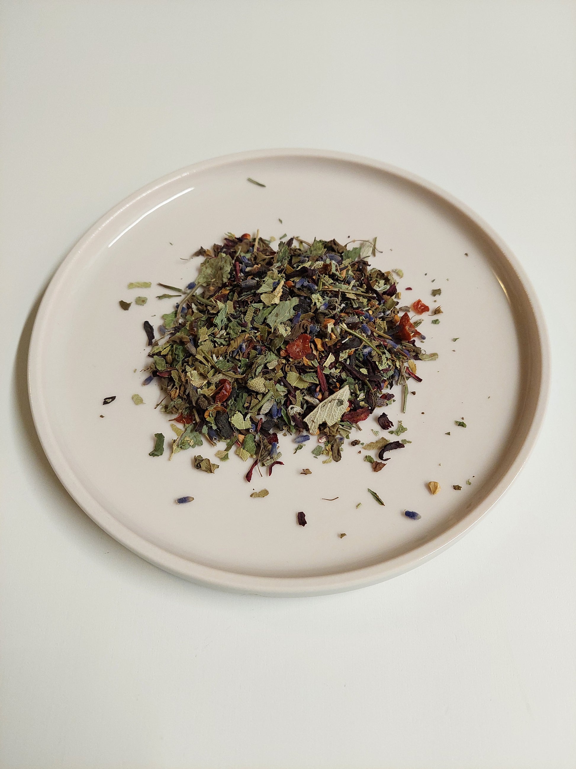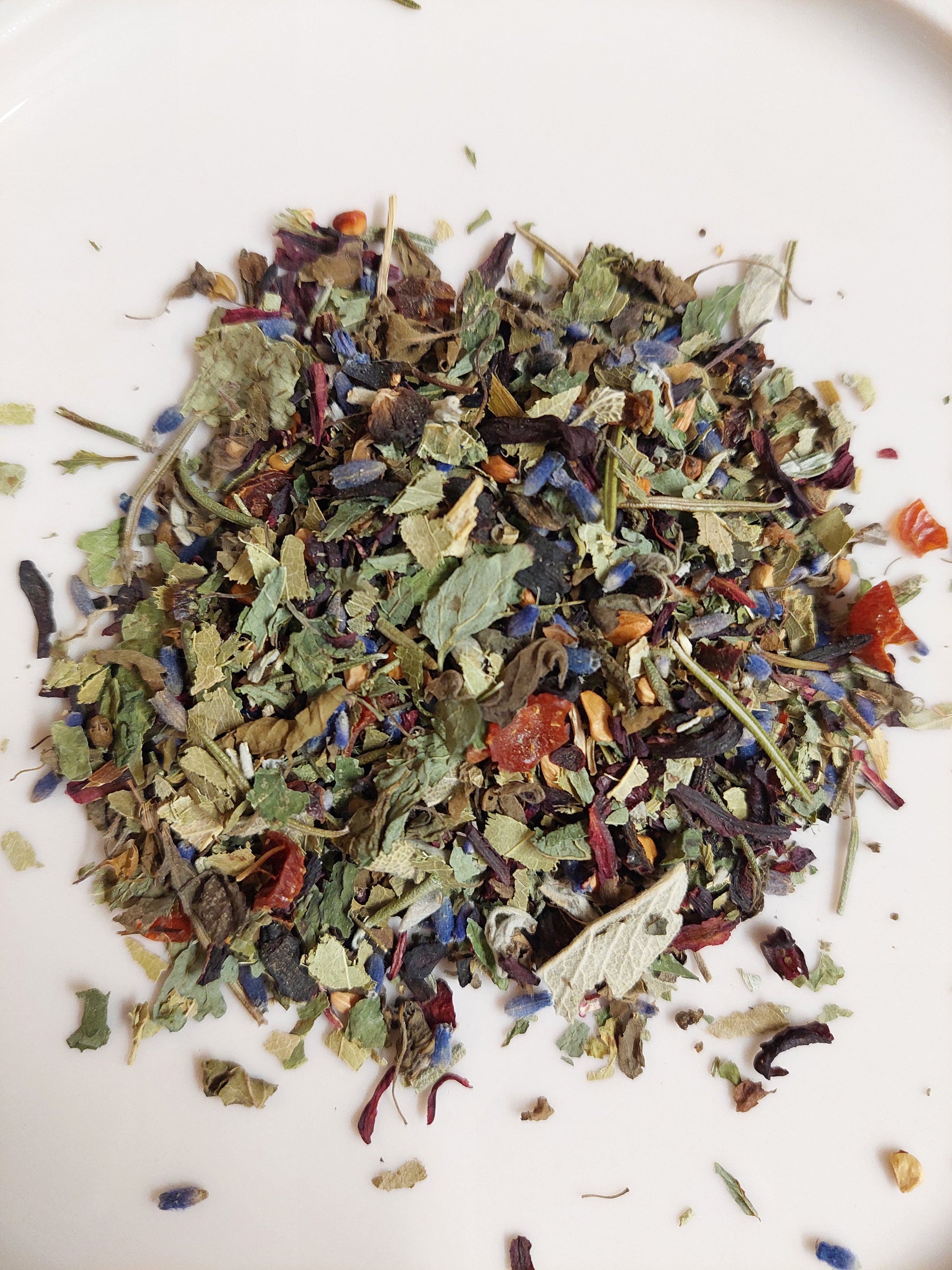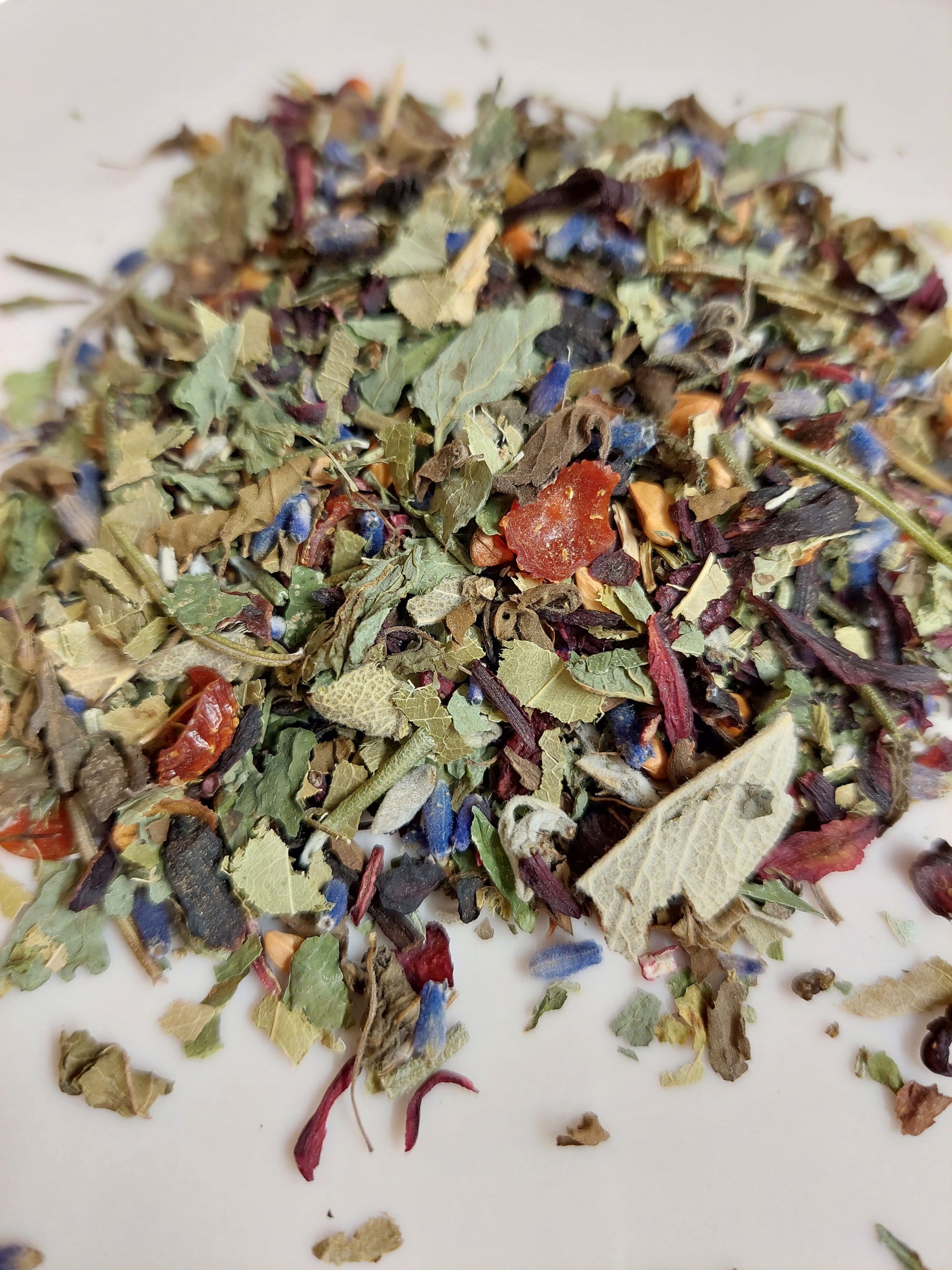 Enthält: Hibiskus, Rosmarin, Hagebutte, Melisse, Salbei, Eschenblätter, Tulsi, Lavendel