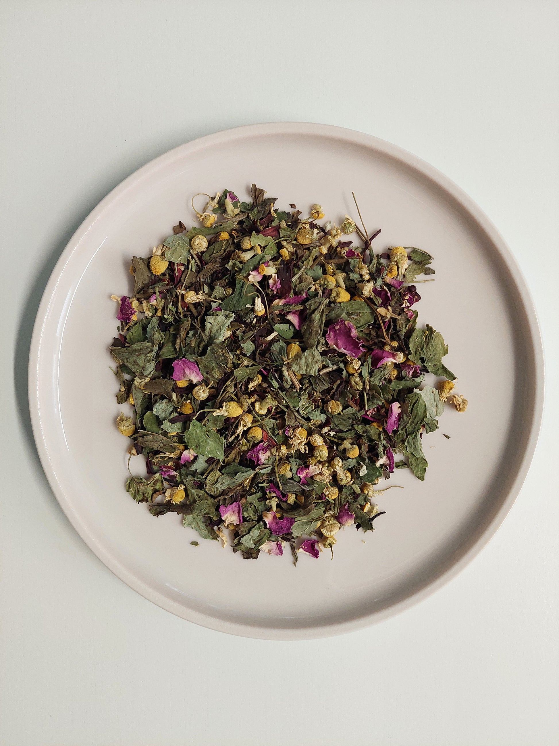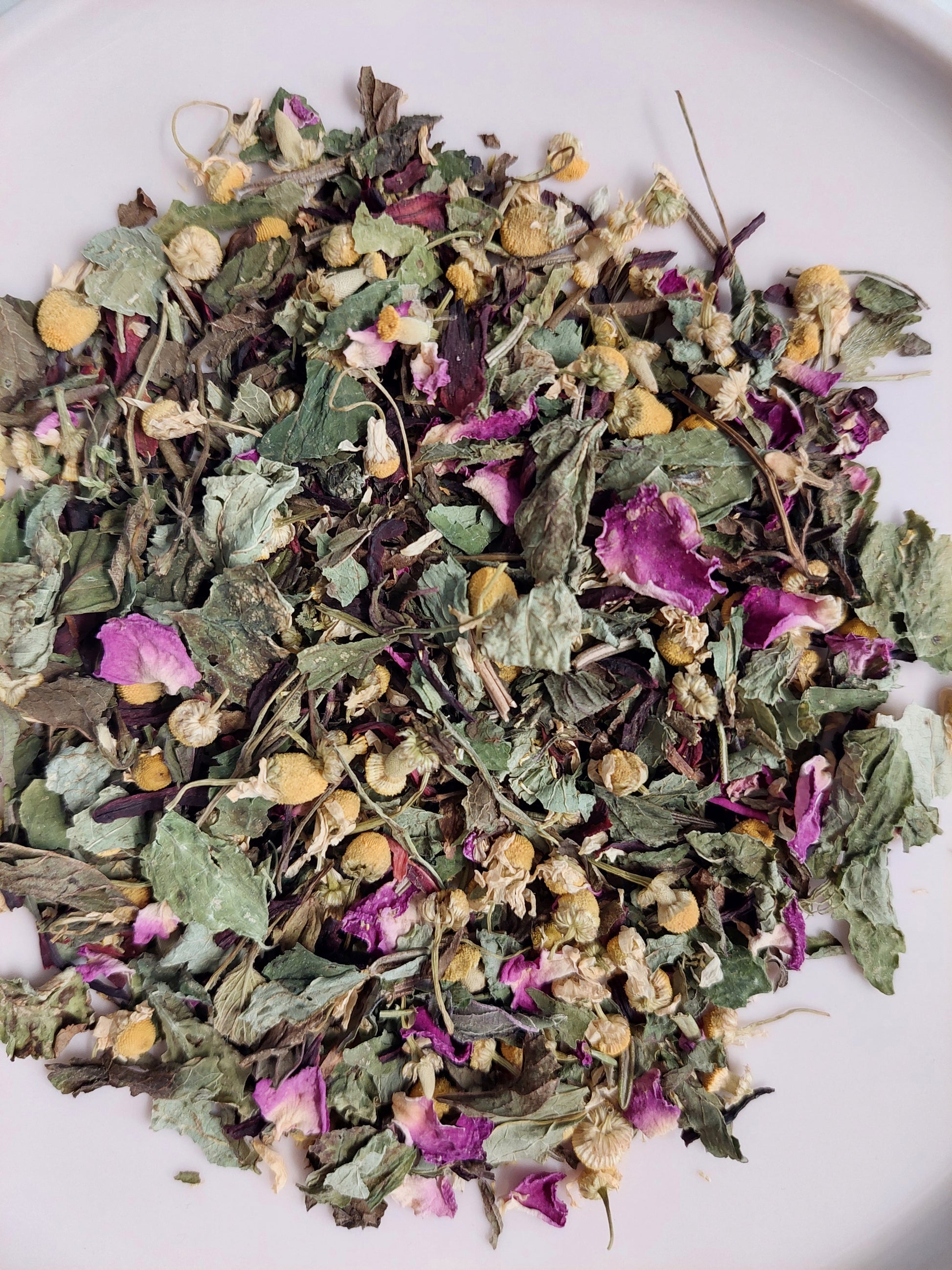 Enthält: Kamillenblüten, Melissenblätter, Rosmarinblätter, Pfefferminzblätter, Rosenblüten, Hibiskusblüten