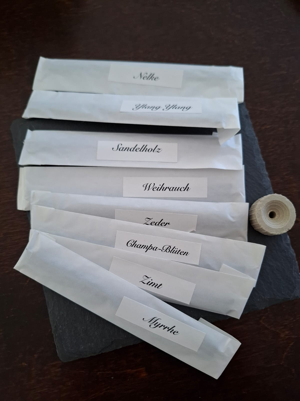 Je 2 Stäbchen aller 8 Sorten: Champa-Blüten, Ylang Ylang, Zimt, Nelke, Zeder, Myrrhe, Weihrauch, Sandelholz.