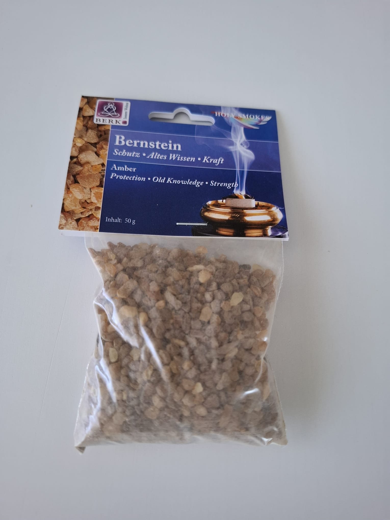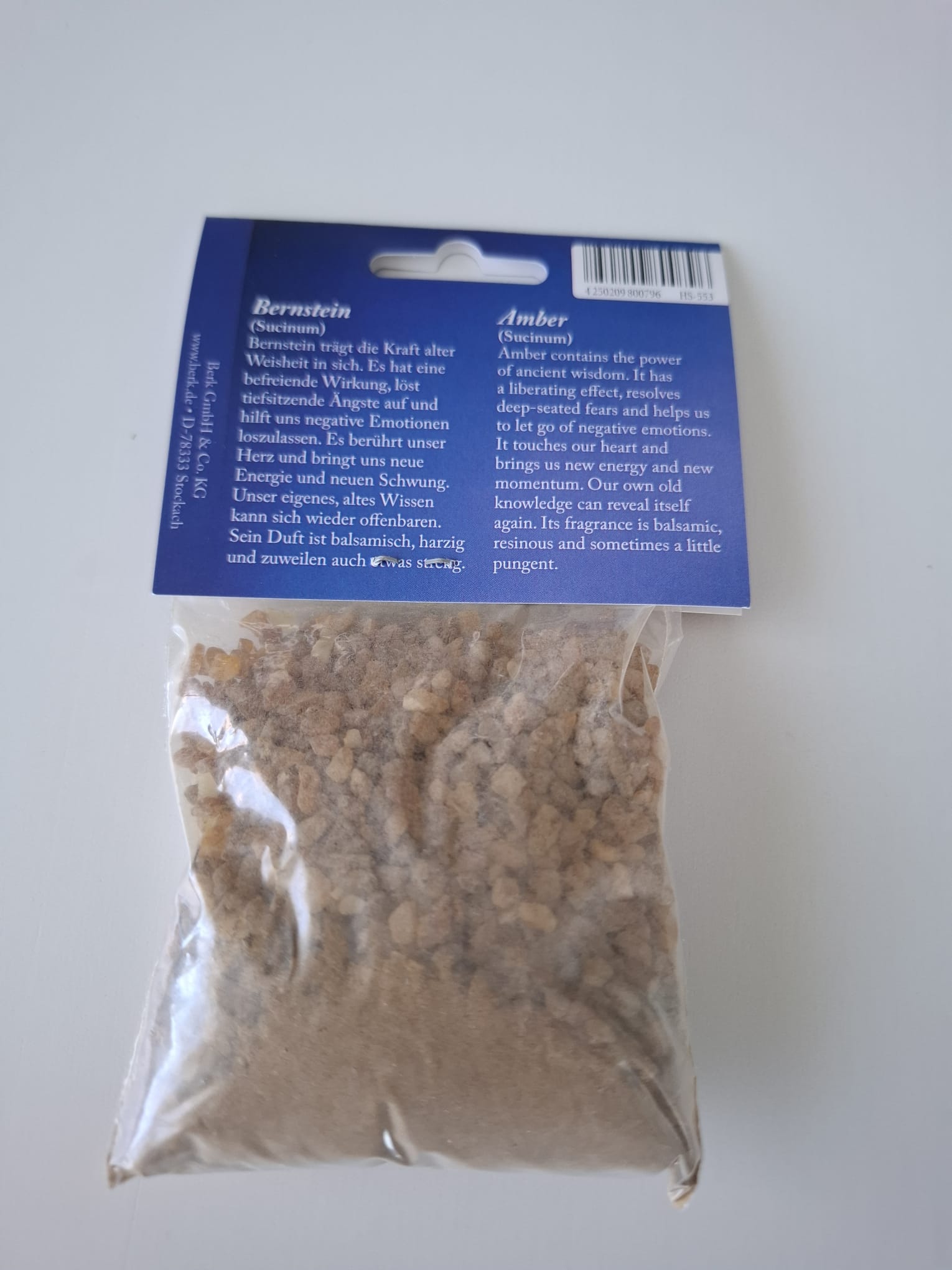 Bernstein ist fossiles Harz, das schon in prähistorischer Zeit von Bäumen ausgeschieden wurde. Der deutsche Name stammt von „Brennstein"-, da er gut brennt. Seinen harzigen Duft, der teils pinienartig, teils etwas schwer und myrrhenähnlich anmutet entfaltet Bernstein aber nur, wenn er langsam verglimmt. Bernstein wurde in der Antike als „Gold des Nordens"- oder auch als „Tränen der Sonnentöchter"- verehrt, was neben dem Hinweis auf die damaligen Hauptfundstellen im Baltikum auf seine interessante Mischung aus sonniger, positiver und ernsthafter, zielgerichteter Energie verweisen mag. Sein Rauch ist daher fast ideal zum Verarbeiten und Integrieren „alter Themen"-geeignet.