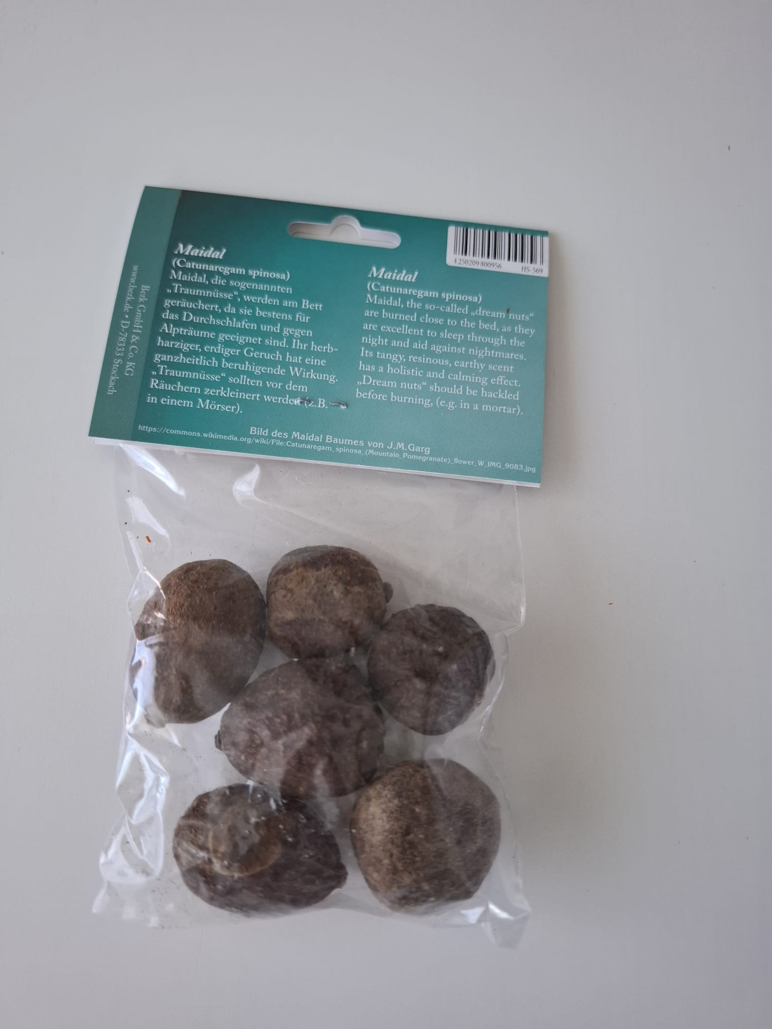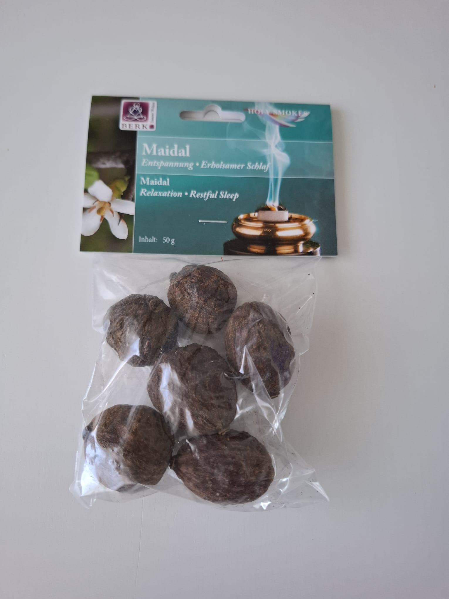 Maidal, die sogenannten "Traumnüsse", werden am Bett geräuchert, da sie bestens für das Durchschlafen und gegen Alpträume geeignet sind. Ihr herb-harziger, erdiger Geruch hat eine ganzheitlich beruhigende Wirkung. "Traumnüsse" sollten vor dem Räuchern zerkleiner werden (z.B. in einem Mörser).