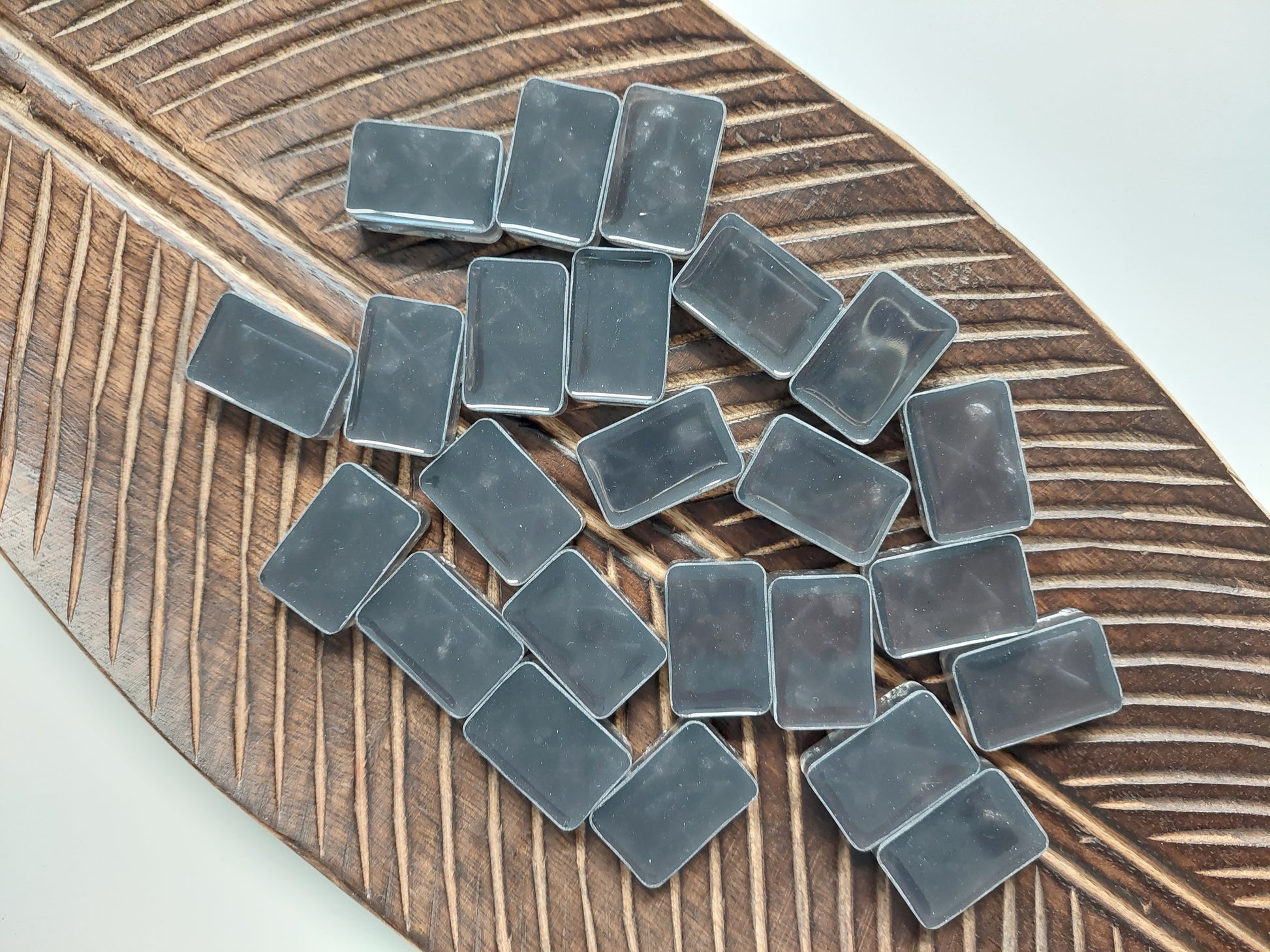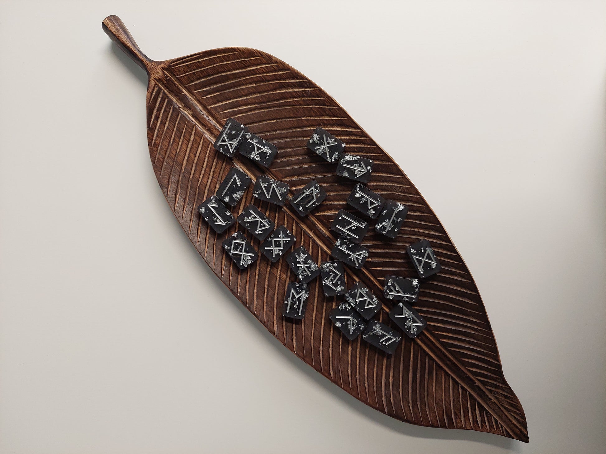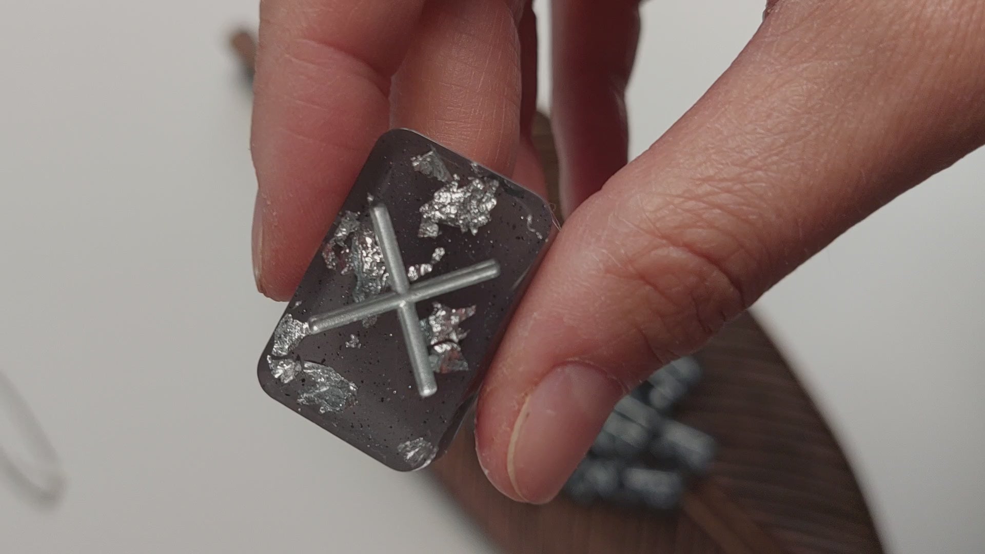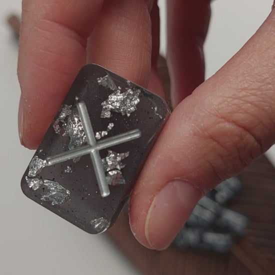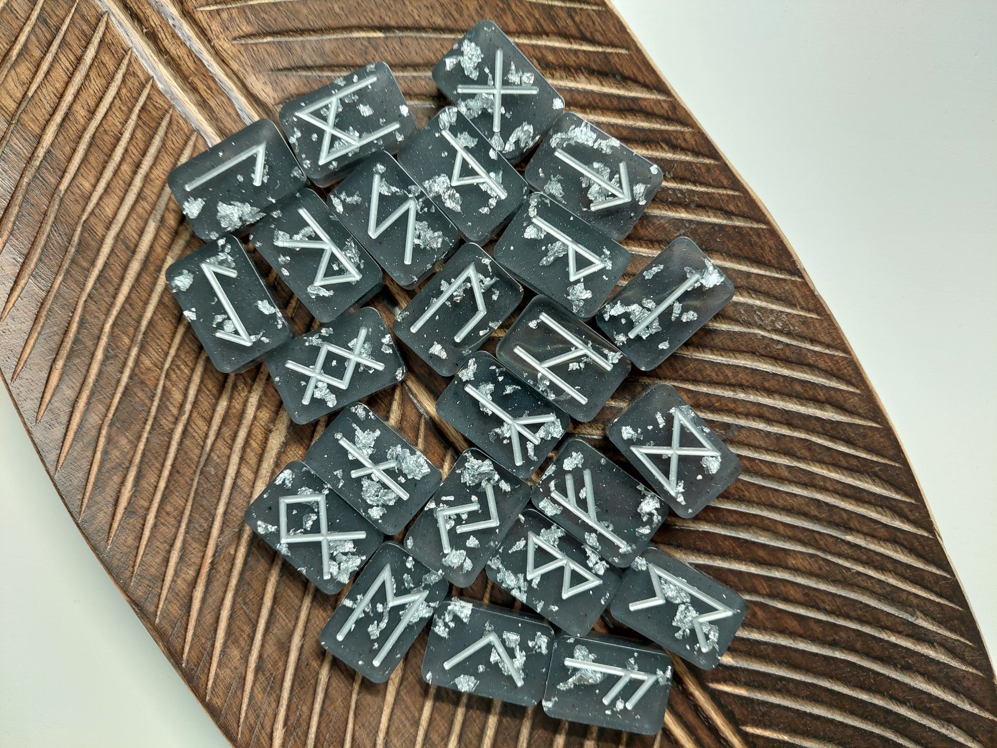 24 Runen nach dem älteren Futhark in Epoxidharz gegossen, mit Silberfolie.