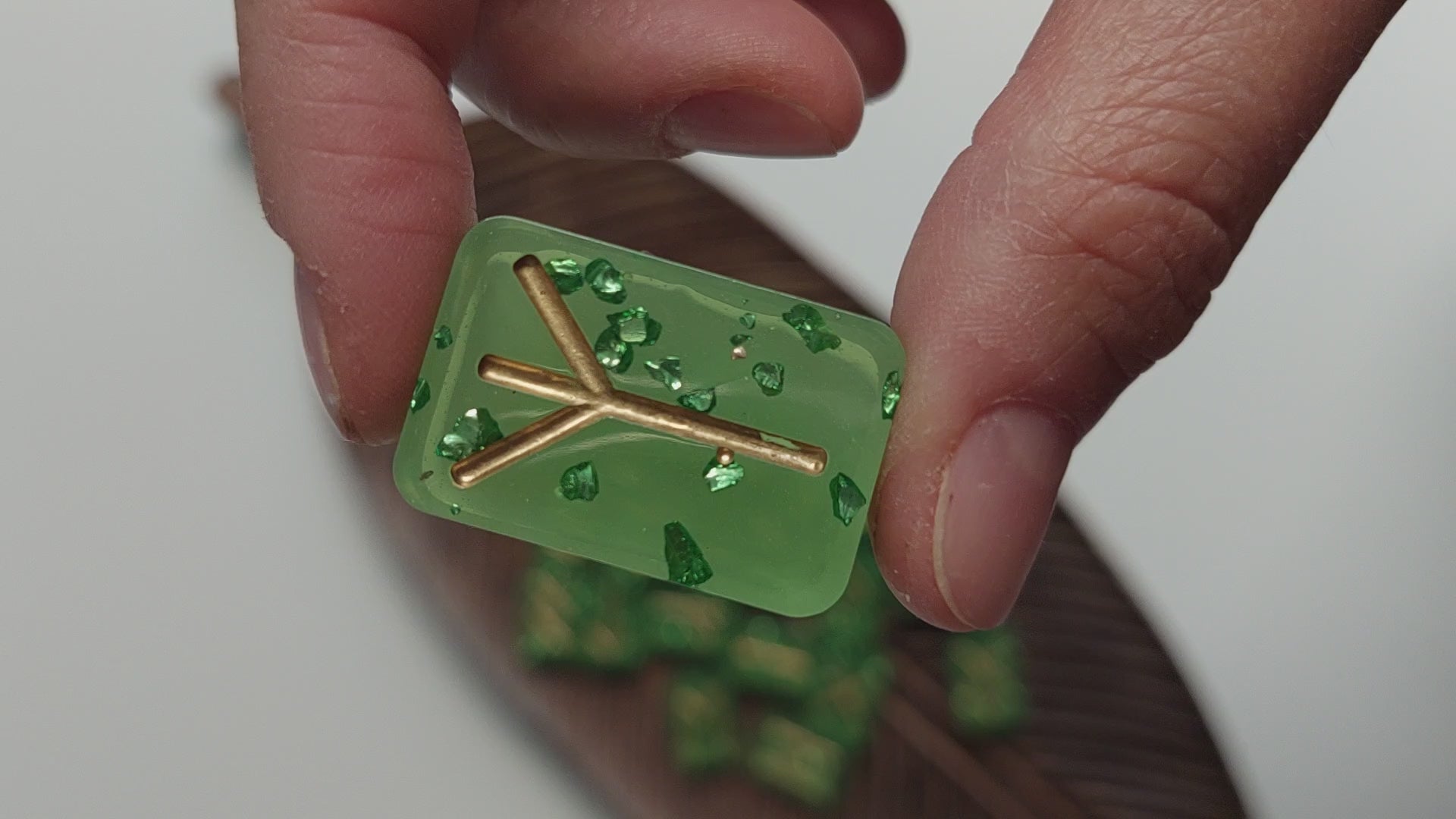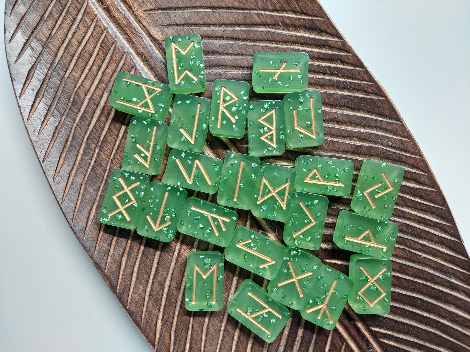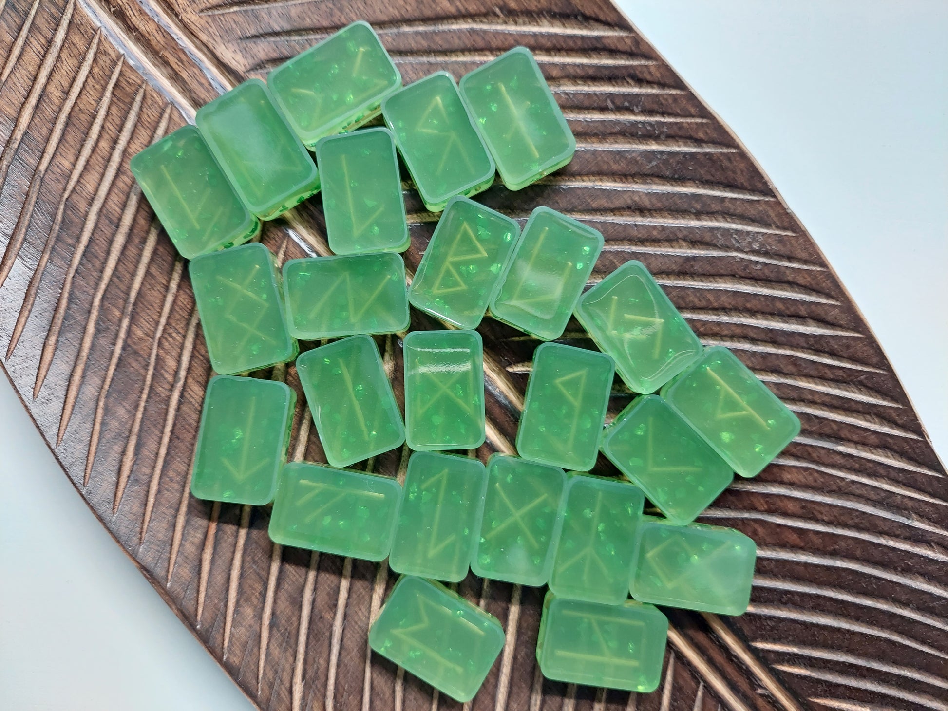 24 Runen nach dem älteren Futhark in Epoxidharz gegossen. Eingegossen wurden grüne Splitter.