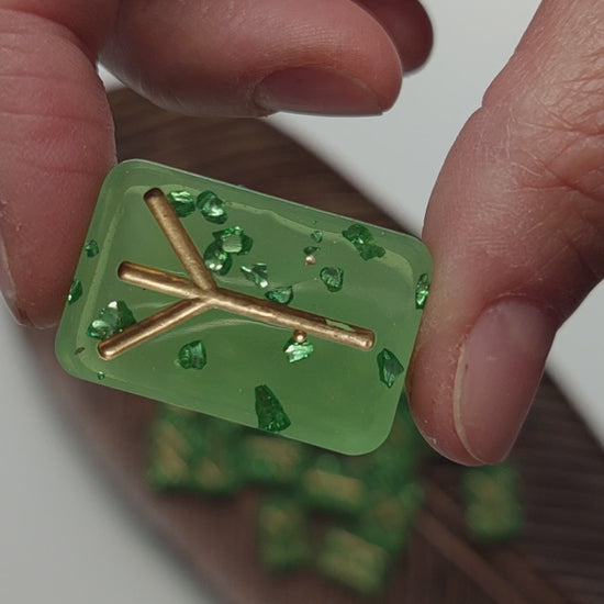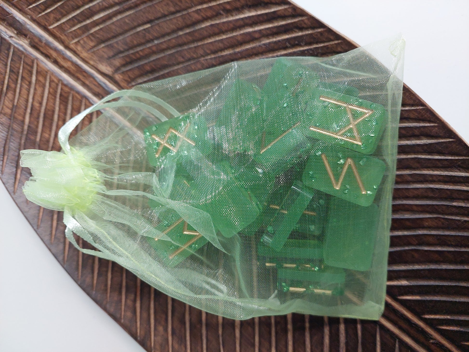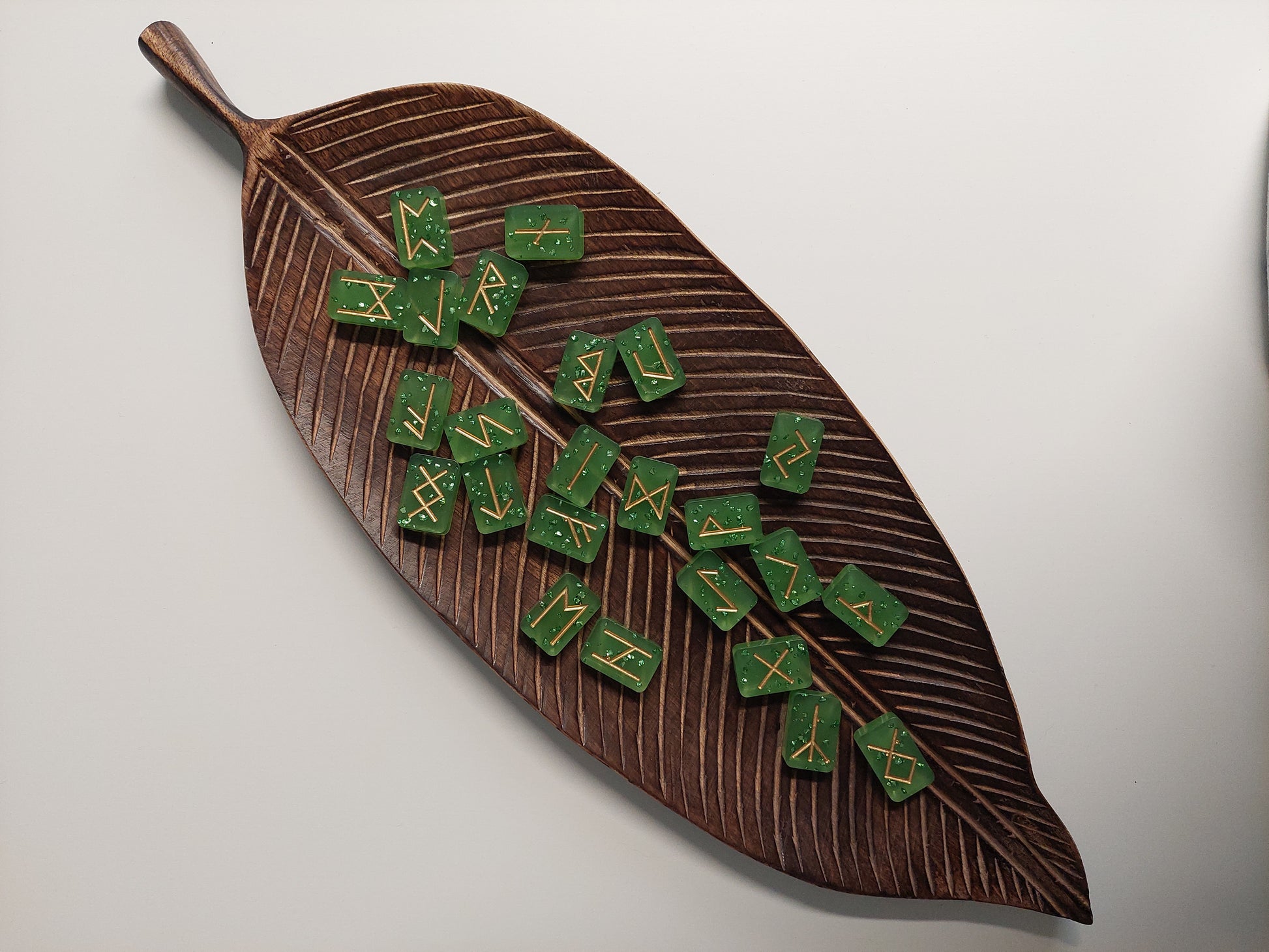 24 Runen nach dem älteren Futhark in Epoxidharz gegossen. Eingegossen wurden grüne Splitter.