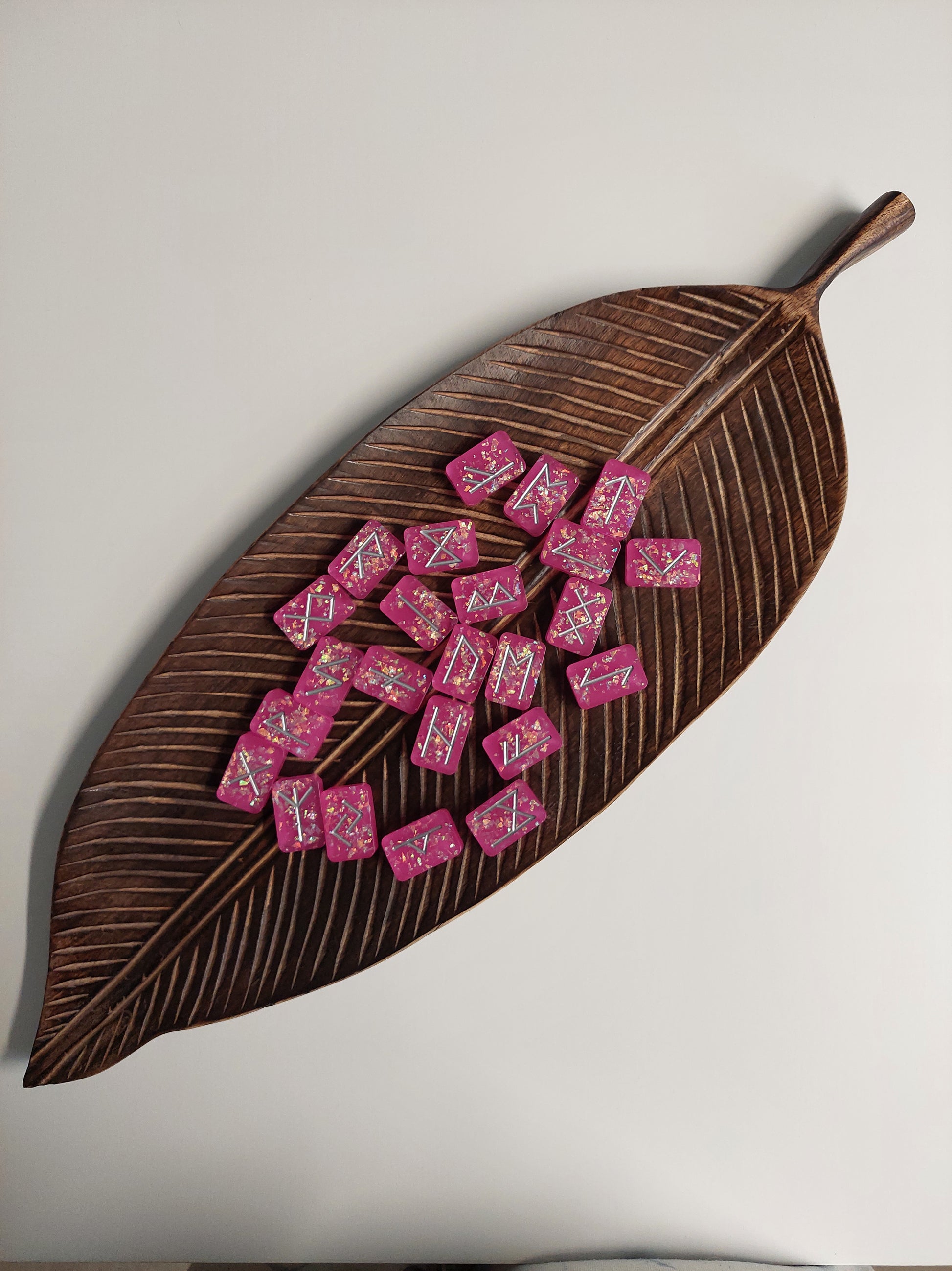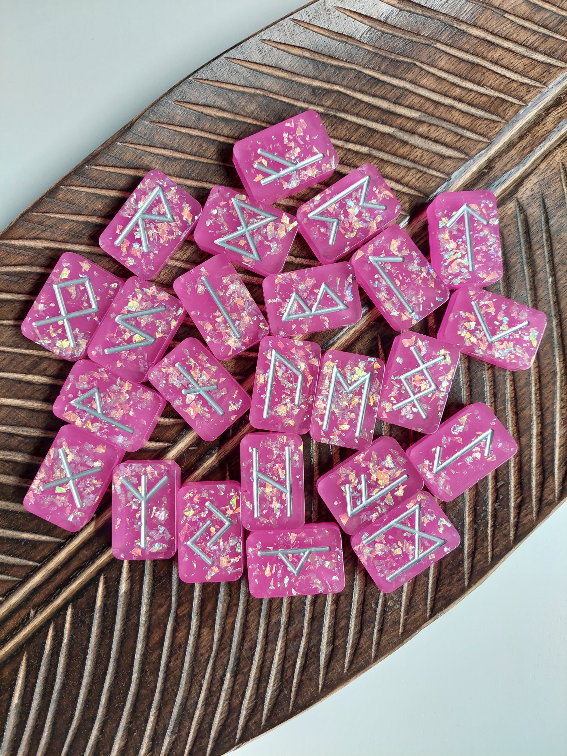 24 Runen nach dem älteren Futhark in Epoxidharz gegossen.