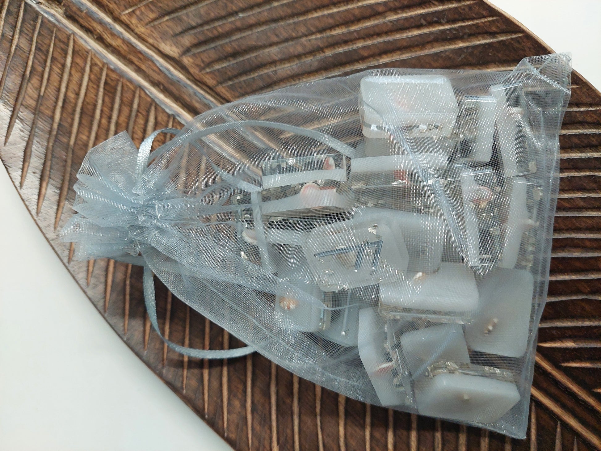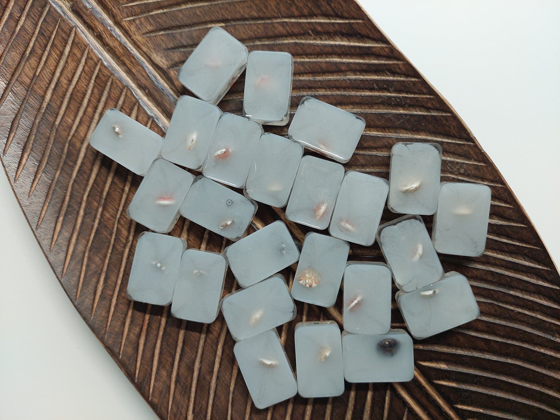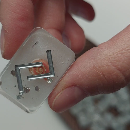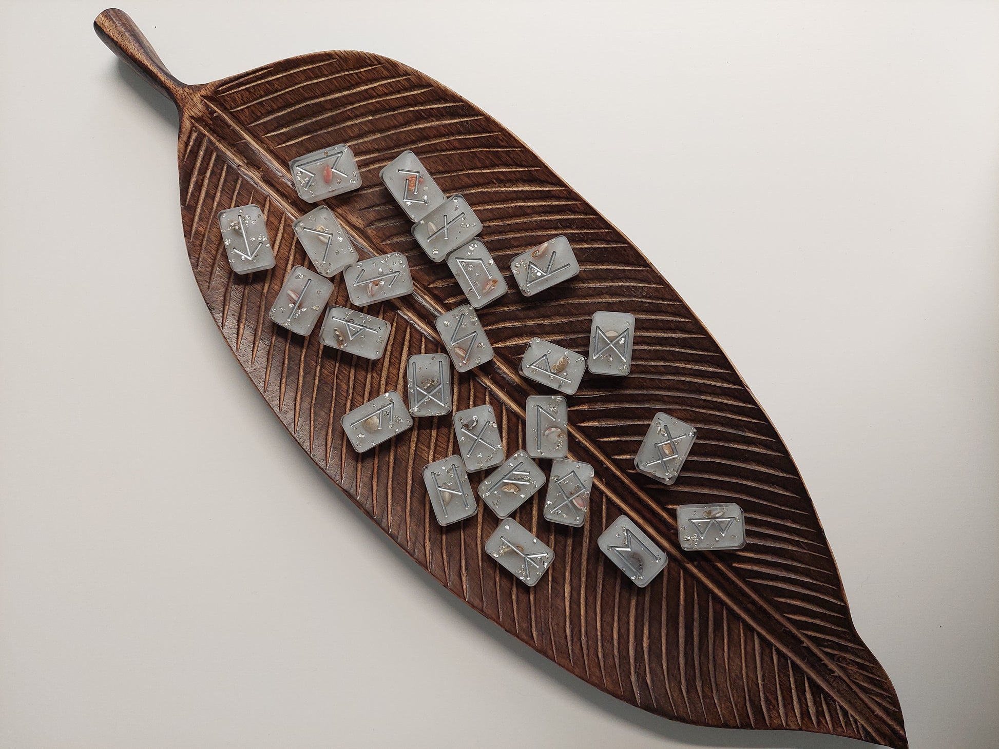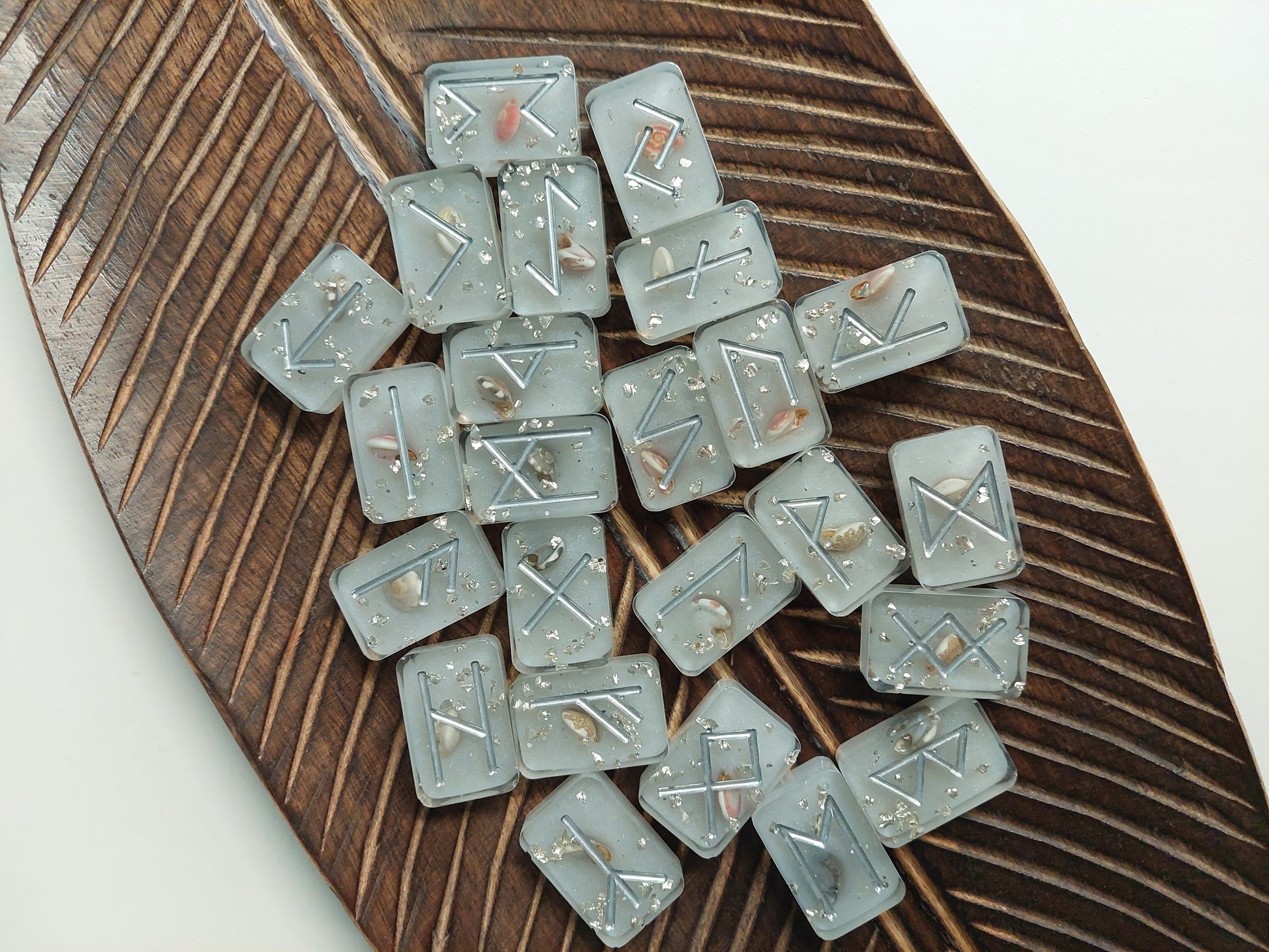 24 Runen nach dem älteren Futhark in Epoxidharz gegossen. Eingegossen wurden silberne Splitter und Schneckenhäuschen. Die Schneckenhäuschen haben sich leider etwas gedreht, d.h. ist dieses Runenset auch etwas günstiger als die anderen.