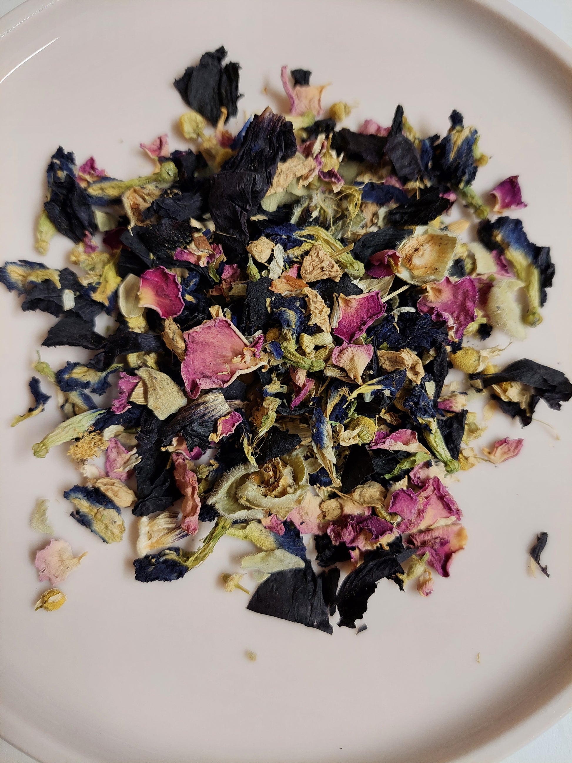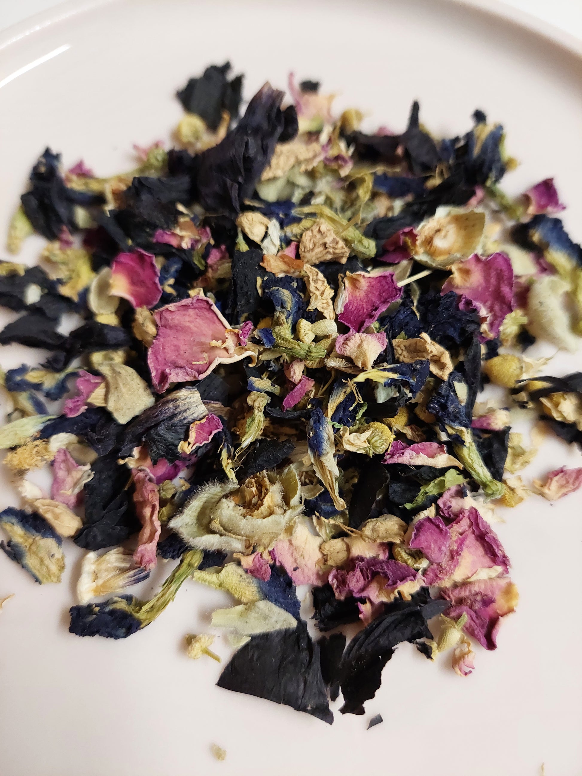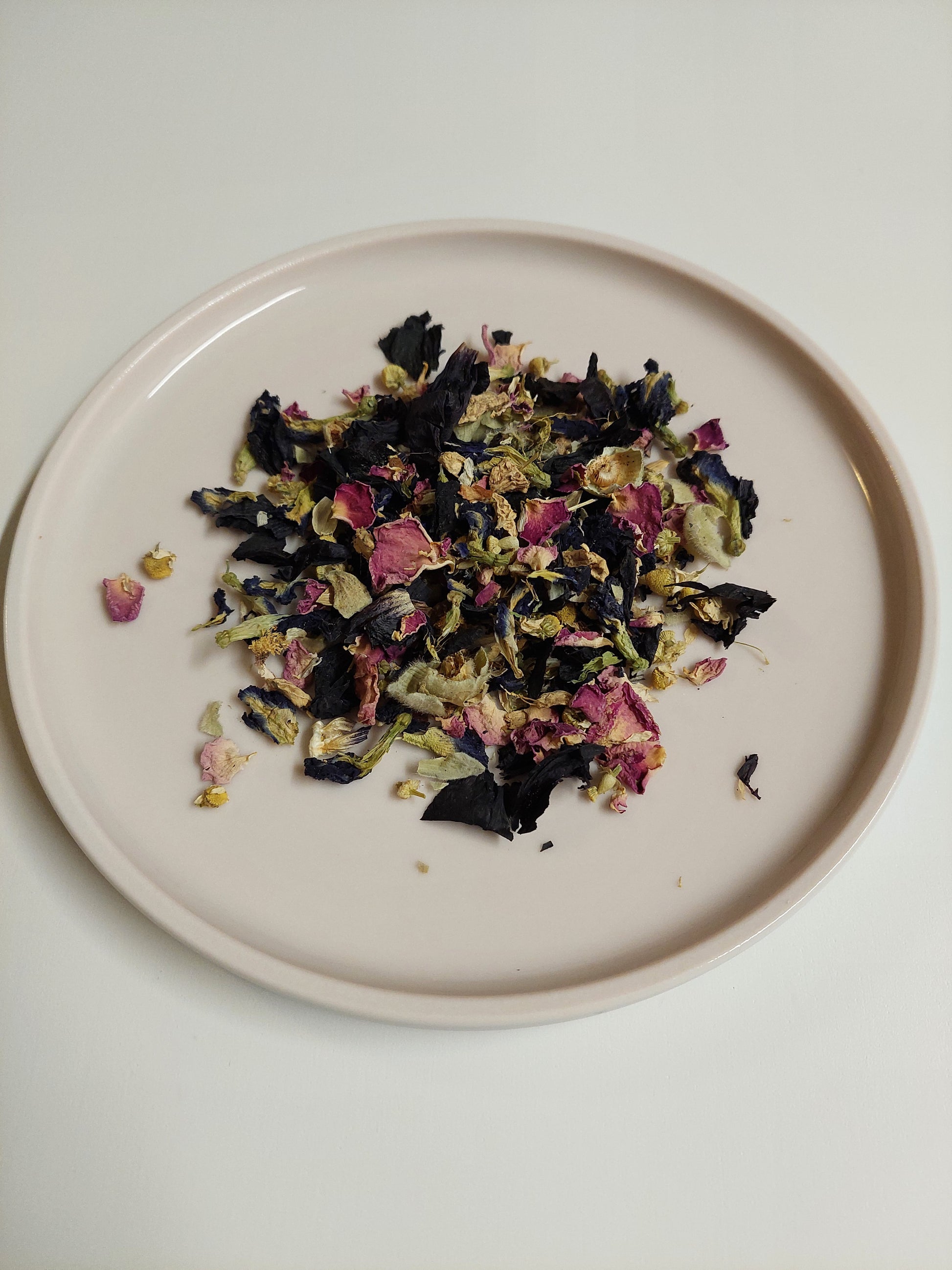 Chili und Ingwer - sehr wärmend, winterliche Gewürze und eine Farbe die Du kaum glaubst, Anchan und schwarze Malve machen diesen Tee Tiefblau. Ein Hingucker, besonders, wenn Du etwas Zitronensaft hinzufügst, wandelt sich der Tee zum magischen Violett. Lass Dich verzaubern...